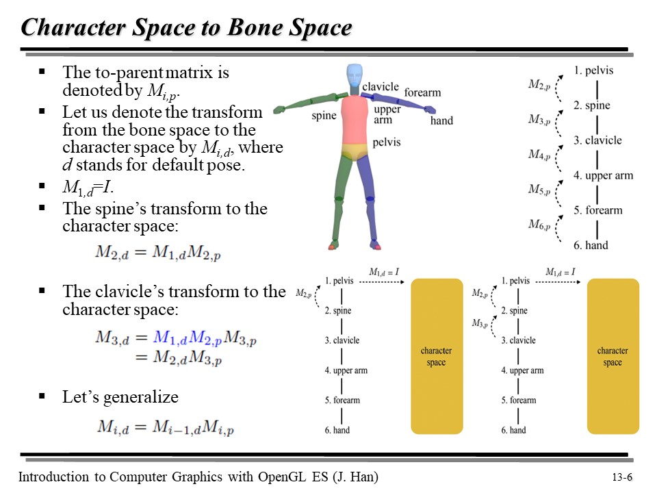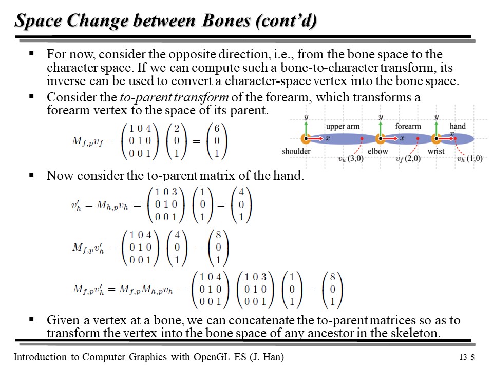 일단 각 Bone Space 에서 정의된 Vertices 는 Character Space 로 변환되어야 한다(Character Space 가 Object Space 임). 즉, 위에서 forearm 에 있는 v5 점을 어떻게 Character Space 로 변환하는지가 핵심인 것이다.