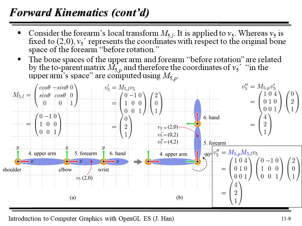 각 뼈들은 독자적으로 움직인다. 위 예에서는 forearm 이 90도 회전한 그림을 보여주고 있는데, 이것을 어떻게 렌더링할 수 있을까?