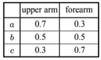 a, b, c 는 각 뼈에 정의된 점이다. 그런데 a 의 경우, upper arm 에서 좌표를 정의할 수도 있고, forearm 에서 좌표를 정의할 수도 있다(왜냐면 걸쳐 있으니까). 한 점이 각 뼈와 얼마나 가까이 있는지를 아래와 같이 표로 정의하고,