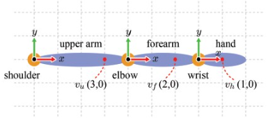 u, f, h 는 각각 upper arm, forearm, hand 에 있는 점을 나타낸다. 각각의 뼈도 joint 를 원점으로 하는 좌표계를 가질 수 있는데... 그 그림이 다음과 같이 잘 나와있다.