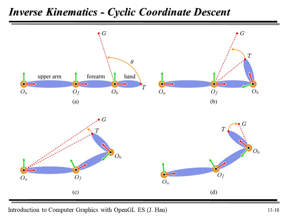 3. Inverse Kinematics 는 끝 점부터 시작하여 Bone 의 위치와 회전을 해석학적으로 결정하는 방식이다. 목표 지점의 끝 Bone 부터 시작하여 회전 및 translation 을 iterative 하게 적용하면 된다.