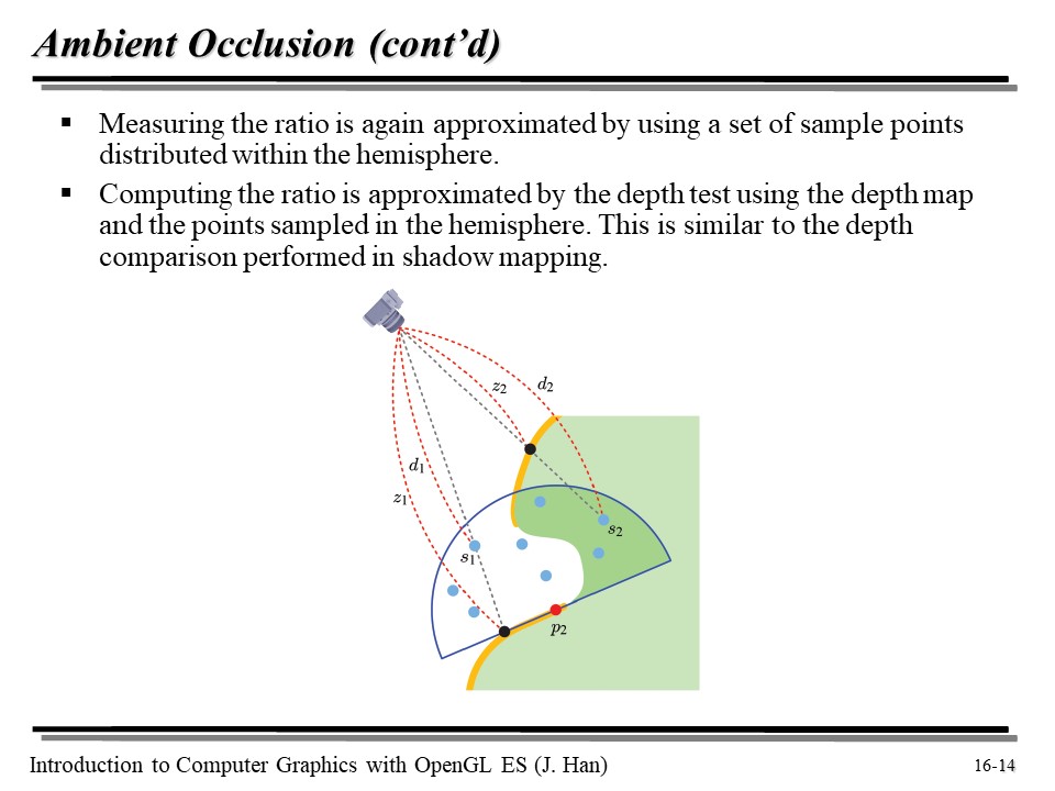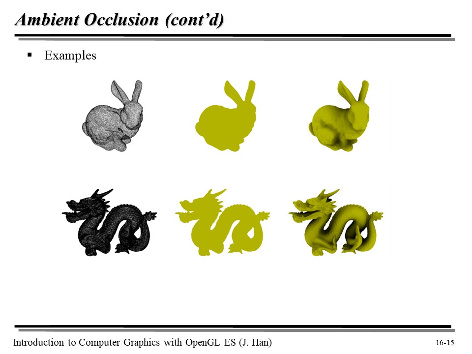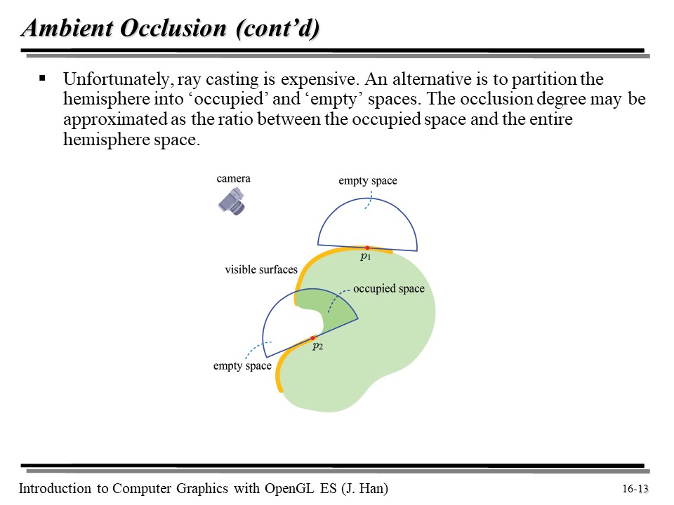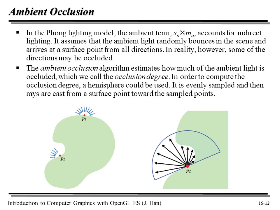 Phong 모델에서 ambient term 을 고려해 보면, 간접광으로 인해 빛을 받는 부분을 계산할 때 실제로는 오목한 부분에서 빛을 잘 받지 못하는 부분이 존재한다는 것을 알 수 있다. 이 경우, 몇몇의 방향들은 occulud 되는데, 이때 반구를 기준으로, 뻗어나가지 못하는 양을 나눈 값을 occulusion degree 라고 부른다.