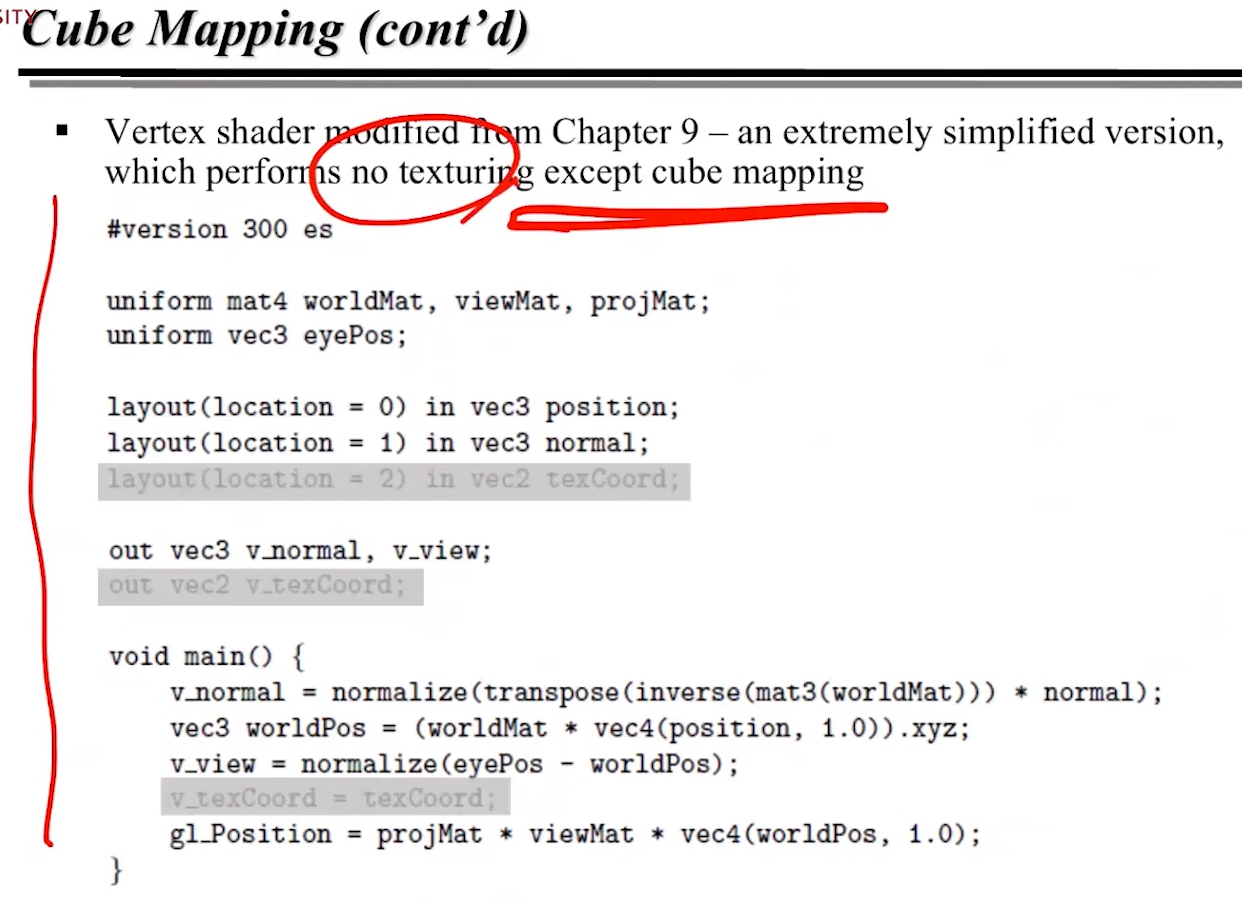 Vertex Shader 를 보자. Cube Mapping 을 적용할 경우, 이제 Vertex Shader 에서 텍스쳐를 위한 연산을 미리해줄 필요도 사라진다 😆