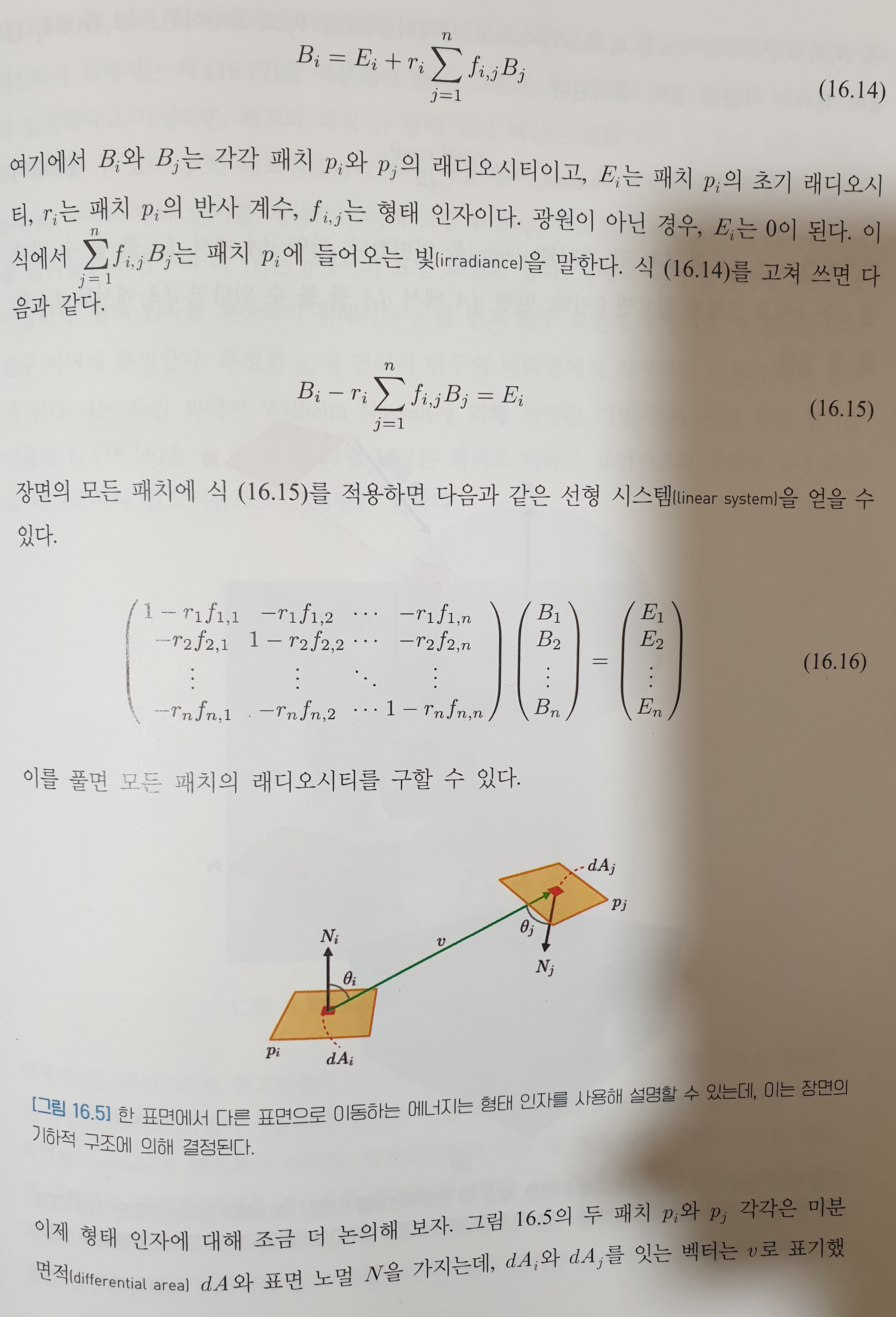 이때, i, j 의 표면처럼 메시를 잘게 쪼갠 것은 패치(Patch) 라고 하고, 이때의 각 패치가 다른 패치에게 보이는 정도(혹은 빛을 반사하는 정도)를 폼 팩터(Form Factor) 라고 한다. 우리는 각 패치 사이의 폼 팩터를 계산하여, 빛이 반사되는 정도를 파악할 것이다.