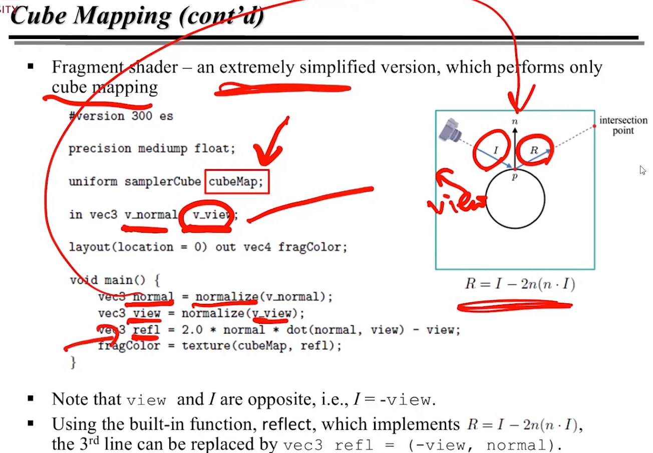 이 녀석은 Normal, View, Reflection 을 계산하는데... Reflection 을 계산할 때, i 벡터와 View 벡터는 방향이 반대니까, i 에 -view 만 넣어주면 계산이 끝난다!