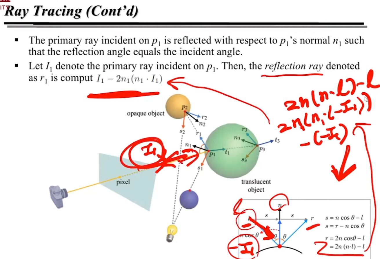 Reflection Ray 는, 말 그대로 반사광이다. I1 을 입사광이라고 생각하고, n1 을 normal vector 라고 보면, 입사각 = 반사각이 되는 벡터 r1 을 그릴 수 있다.