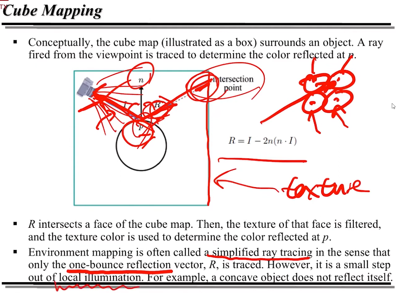 이건... 사실 Ray Tracing 을 하되, 반사 계수를 1로 설정한 것과 동일하다 😉 반사된 녀석의 값을 그대로 cube map 에 기록하면 되기 때문이다! 하지만, 아쉽게도 concave(오목한) 오브젝트는 처리할 수 없다. 왜냐하면 오목한 녀석은 빛을 반사하지 않을 것이기 때문이다!