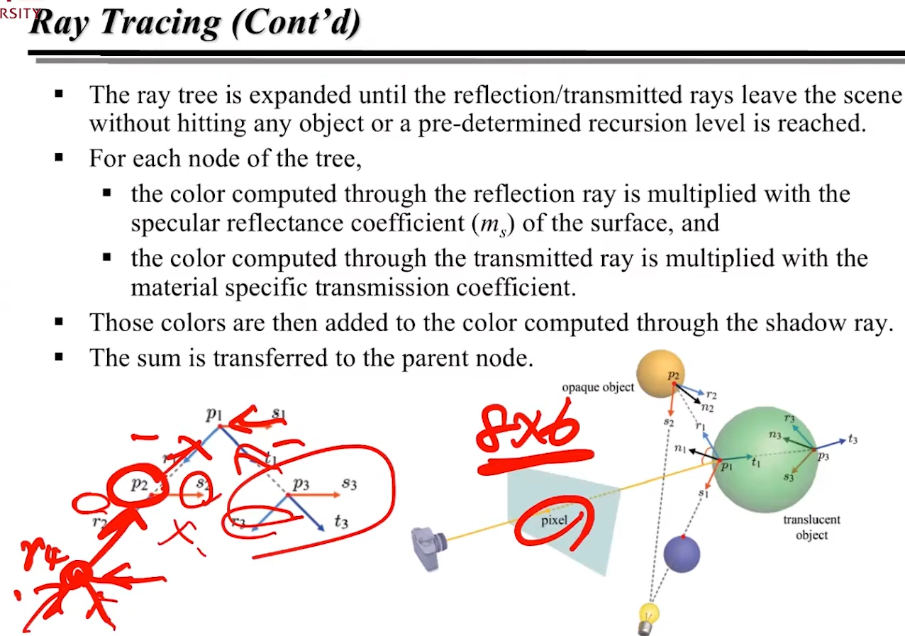 reflection ray 를 통해 계산된 색상은 표면의 specular reflectance 계수 (Ms) 와 곱해지고, transmitted ray(굴절광) 을 통해 계산된 색상은 material specific transmission 계수와 곱해진다.