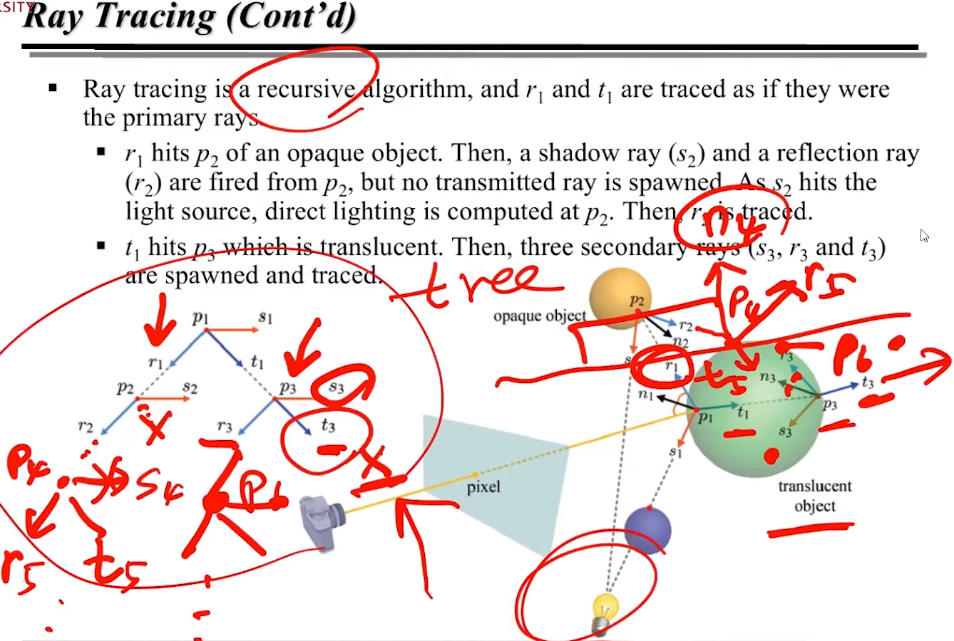 그런데 Ray Tracing 은 Recursive 한 알고리즘이다. 즉, r1 과 t1 은 다른 녀석들의 Primary Ray 처럼 작동한다.