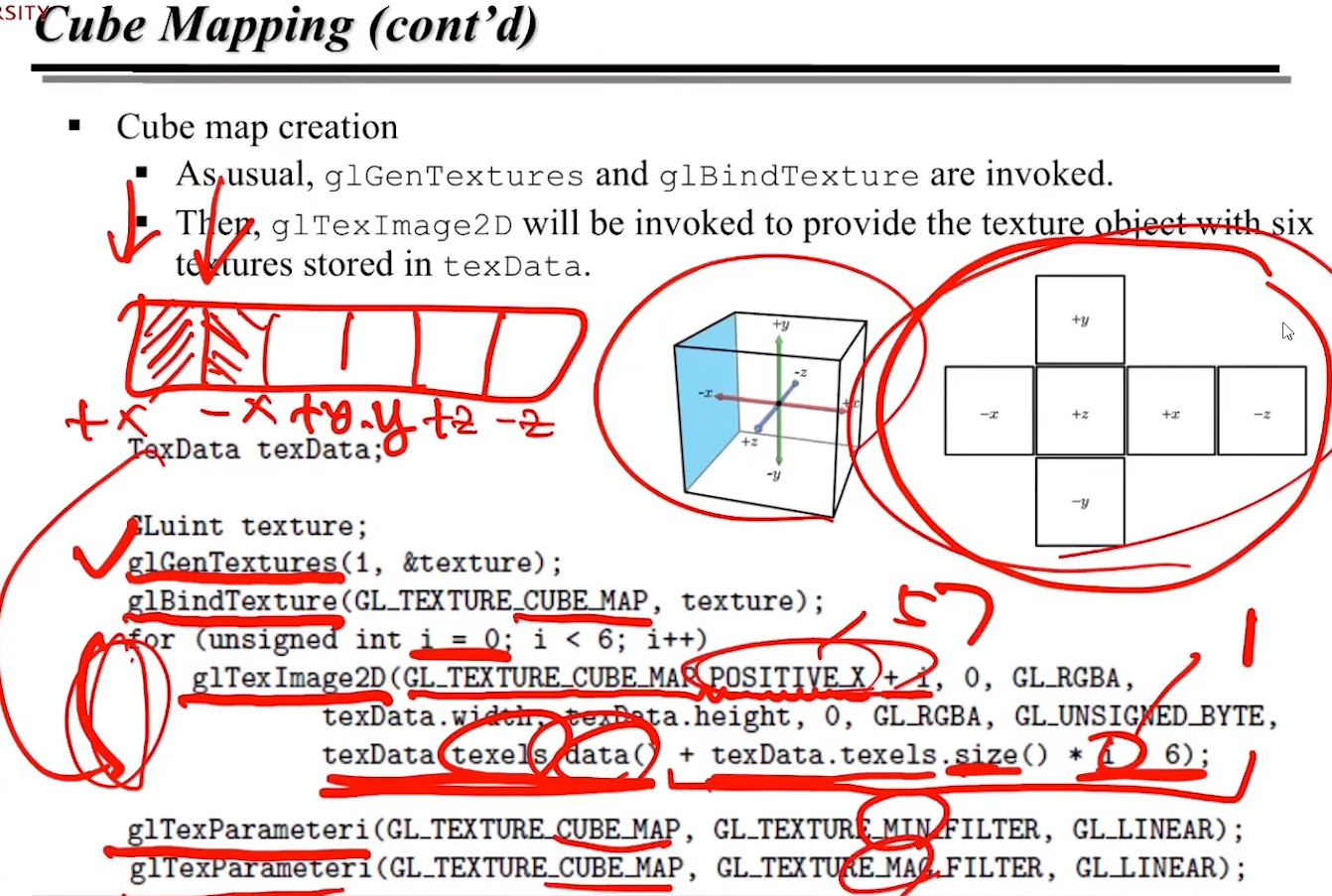 Cube Mapping 을 만드는 방법은, 이전에서 텍스쳐 맵을 만드는 것과 유사하다. Generate 하고, Binding 한 후, 값을 채워주기만 하면 된다!