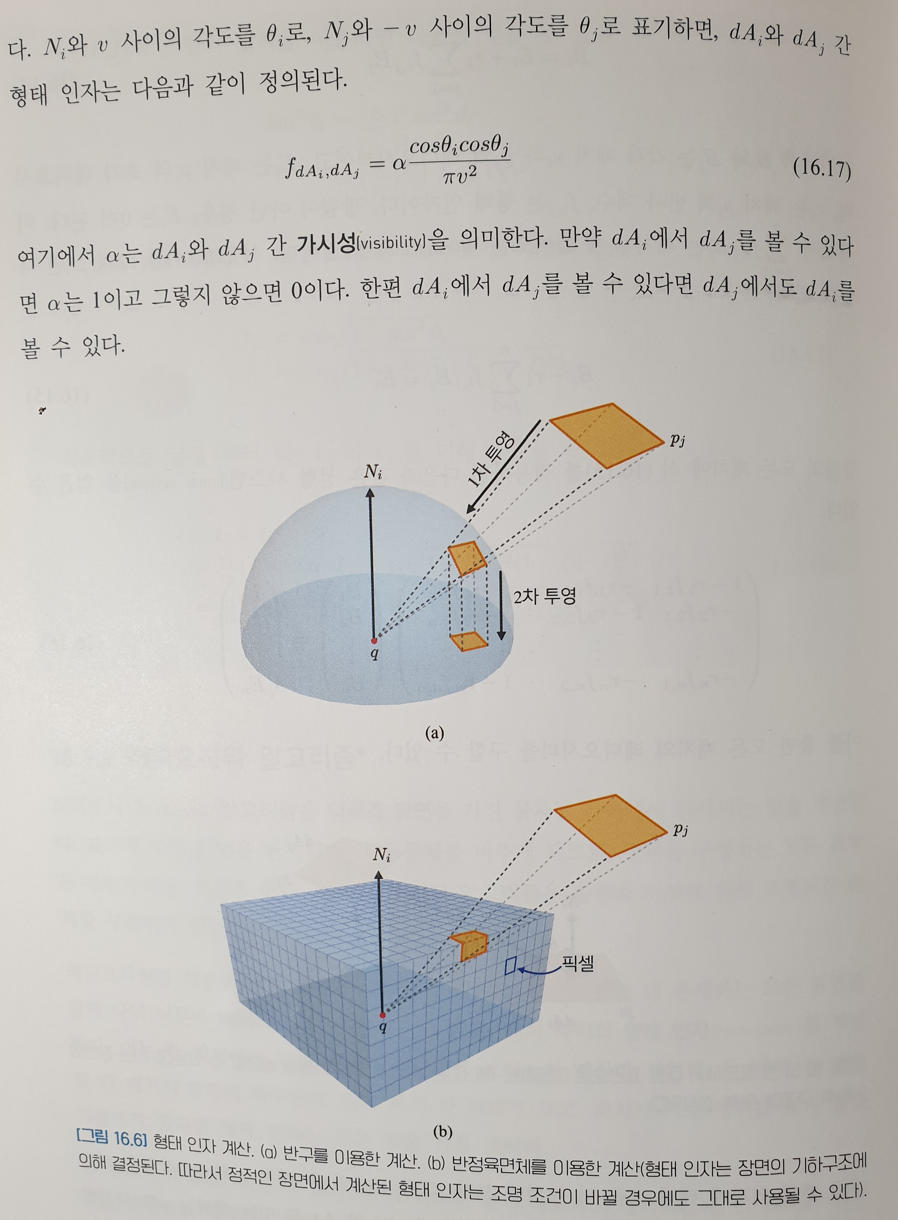 이때, i, j 의 표면처럼 메시를 잘게 쪼갠 것은 패치(Patch) 라고 하고, 이때의 각 패치가 다른 패치에게 보이는 정도(혹은 빛을 반사하는 정도)를 폼 팩터(Form Factor) 라고 한다. 우리는 각 패치 사이의 폼 팩터를 계산하여, 빛이 반사되는 정도를 파악할 것이다.