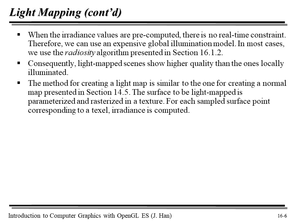 즉, irradiance 는 미리 계산이 가능하며, 이것은 light map 이라는 이름으로 저장된다.