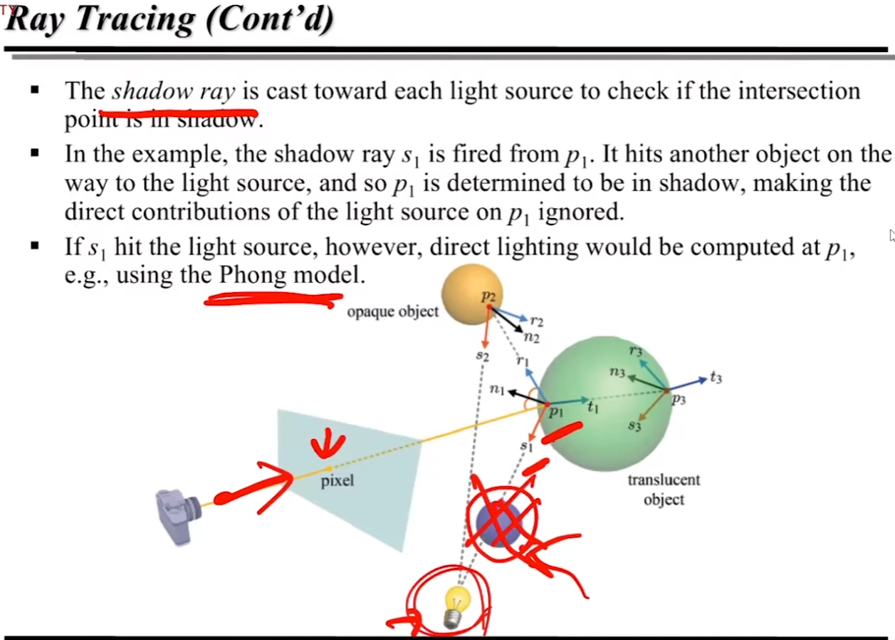 일단 카메라로부터, Ray 를 쏜다고 했을 때, 해당 Ray 가 초록색 공에 부딪혔다고 가정하자. 이때의 점은 p1 이 되는데... p1 의 경우, light source 로부터 직접적으로 빛을 받지 못하고 있다. 즉, p1 점의 경우, 그림자가 질 것이라고 간주될 것이다. s1 은 shadow ray 로, 그림자가 질 경우에는 s1 과 부딪히는 녀석은 빛을 받지 못하는 것으로 인식될 것이다. 반면 p2 처럼 빛을 실제로 받는 녀석은, s2 와 부딪힌 녀석은 Phong 모델을 적용하여 Lighting 을 처리하면 된다! 😄