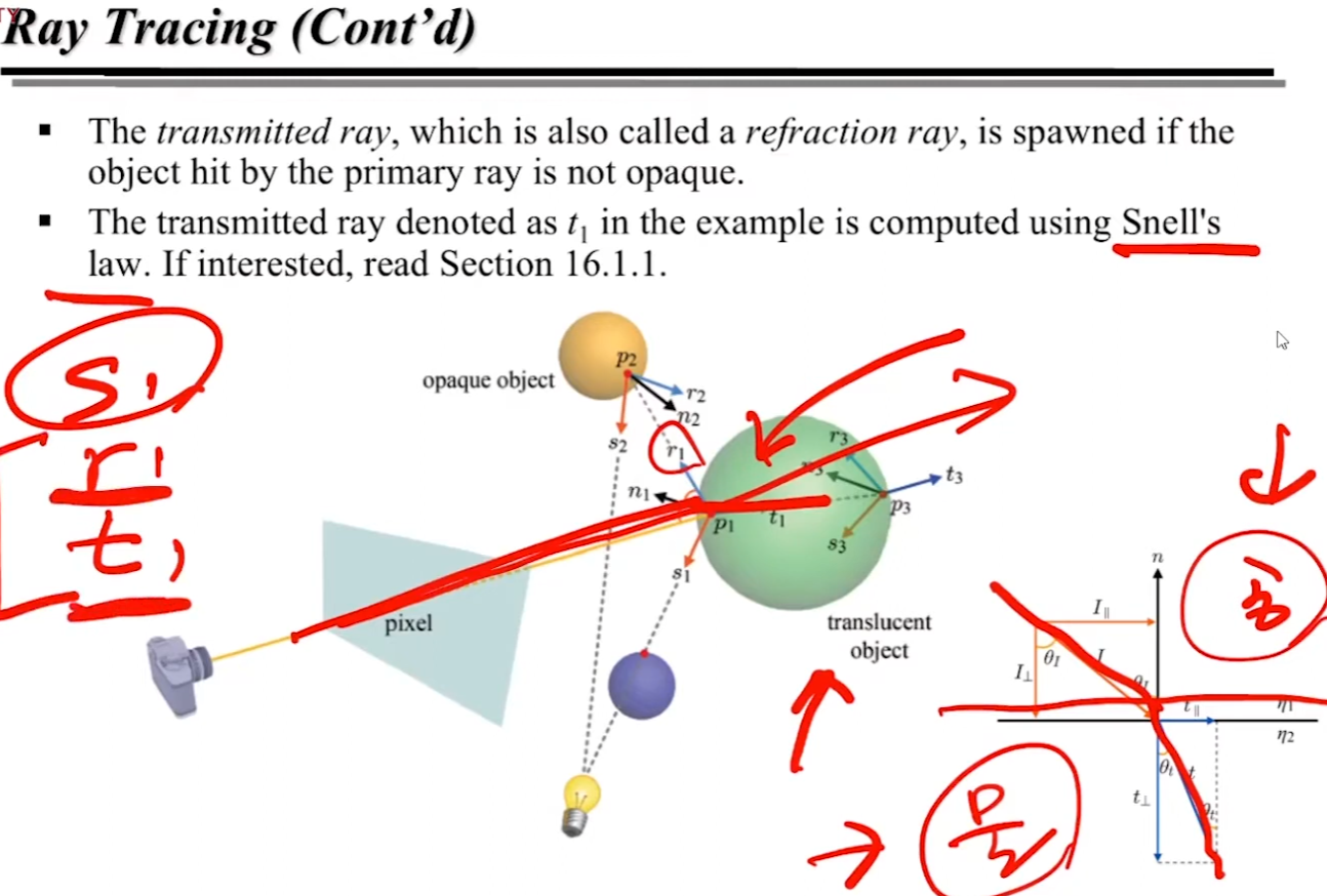 그런데 Ray Tracing 은 Recursive 한 알고리즘이다. 즉, r1 과 t1 은 다른 녀석들의 Primary Ray 처럼 작동한다.