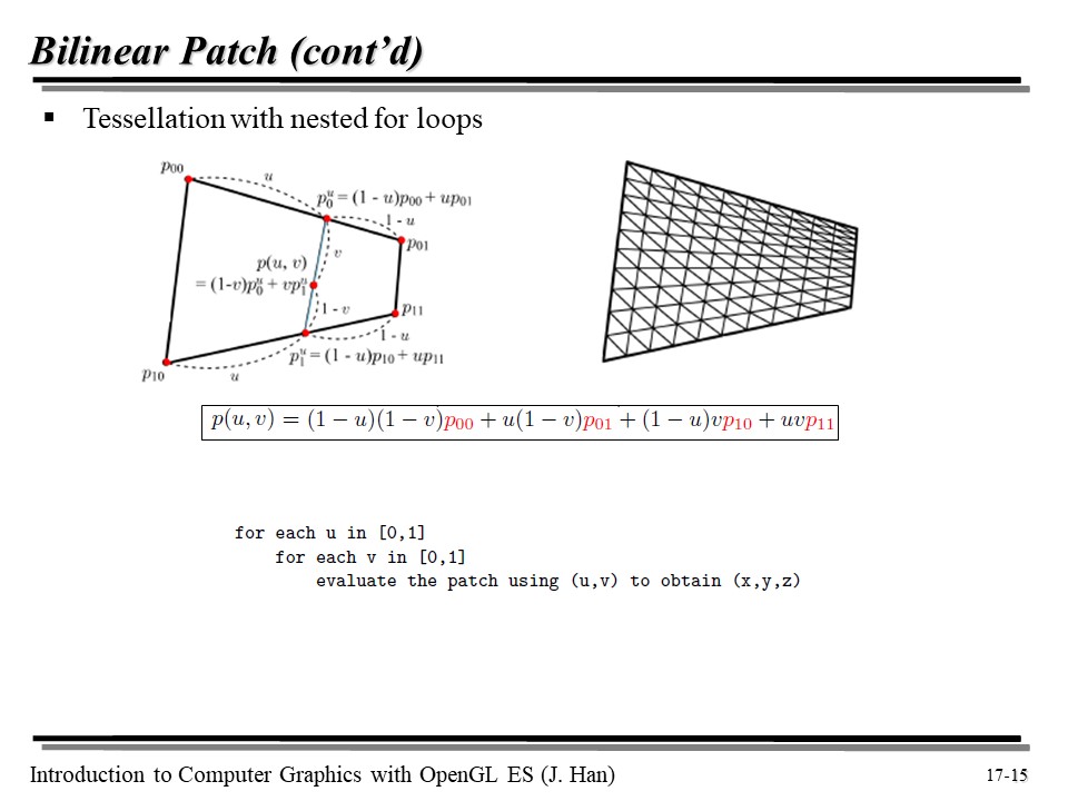 뭐 일단 테셀레이션의 관건은, 위에서 선형 보간 변수로 잡은 u, v 를 얼만큼의 간격으로 진행시킬지.. 일 것이다. 위의 테셀레이션은 그냥 nested for loop 으로도 표현할 수 있다.