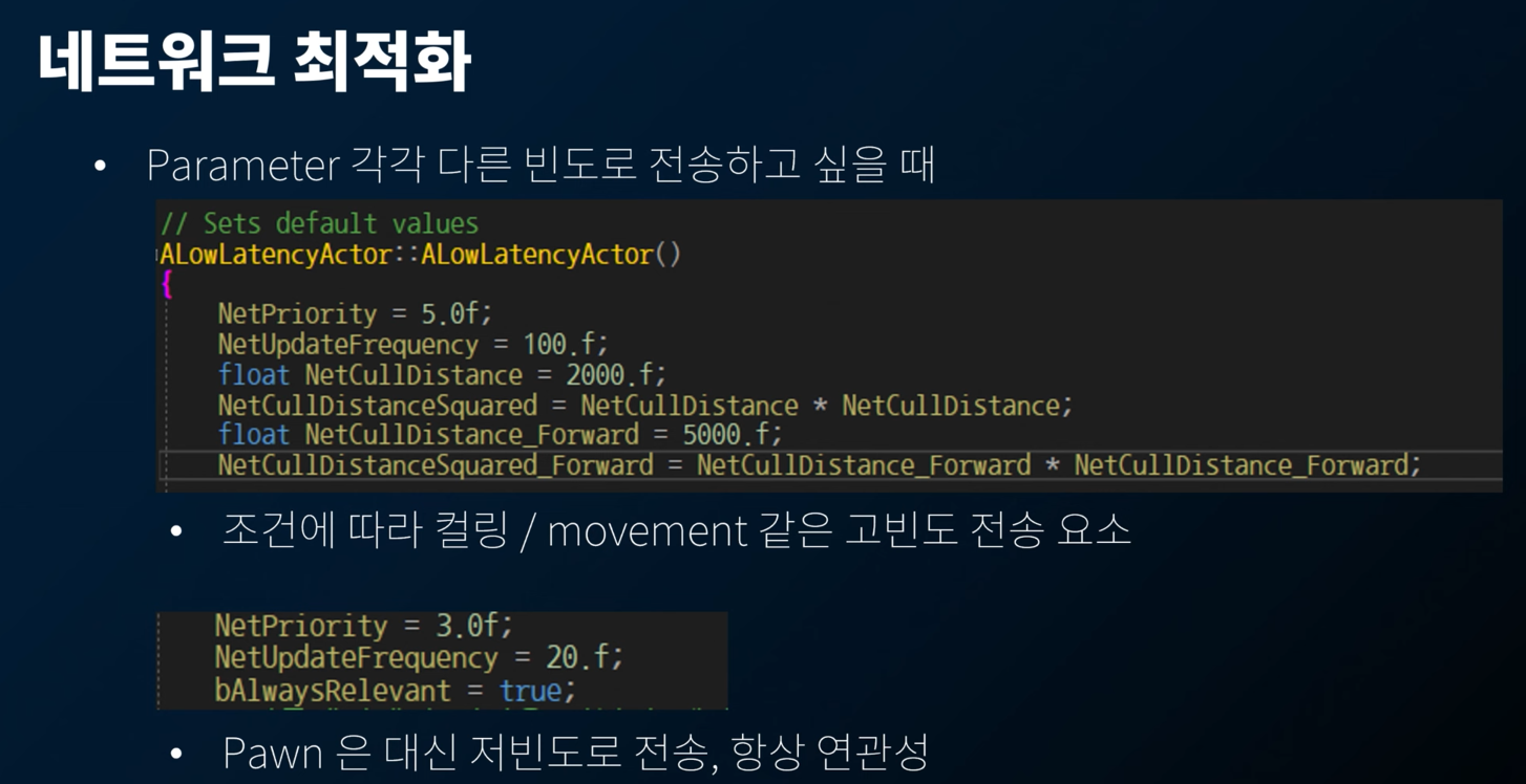 따라서, 가까운 유저에 대해서는 고빈도로 Replication 되도록, 멀리 있으면 더 낮은 빈도로 Replication 되도록 NetCull 관련 변수를 설정했다. 가까운 곳에 있으면 ALowLatencyActor 를 만들어 주고, 거리가 멀어지면 자동 소멸하게 만드는 식인 것 같다 😅