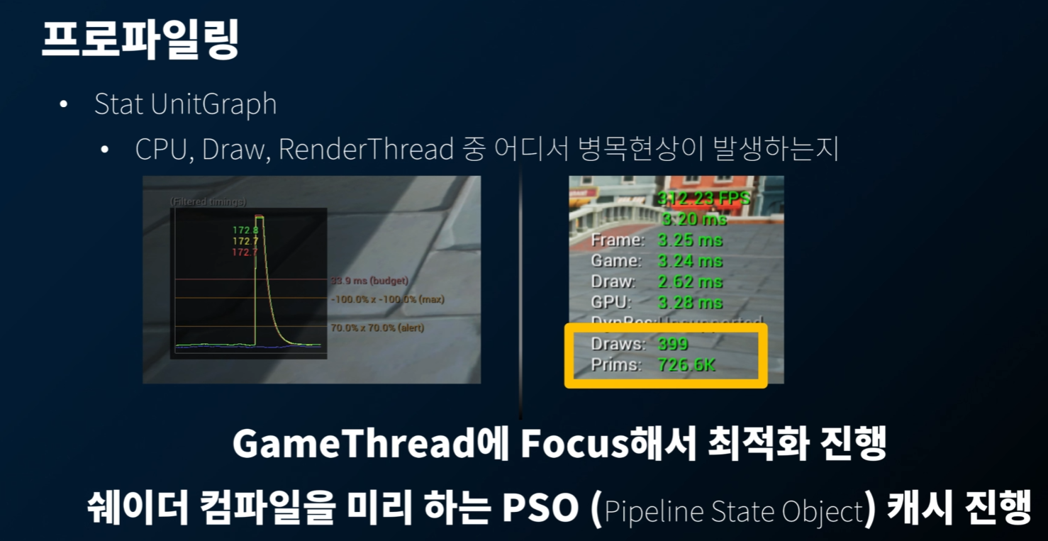 강의에서는 다루지 않았지만... RenderThread 의 경우, PSO 캐시를 통해 최적화를 진행하였다고 한다. 관련 내용은 공식 문서에 있음! 4.27 버전