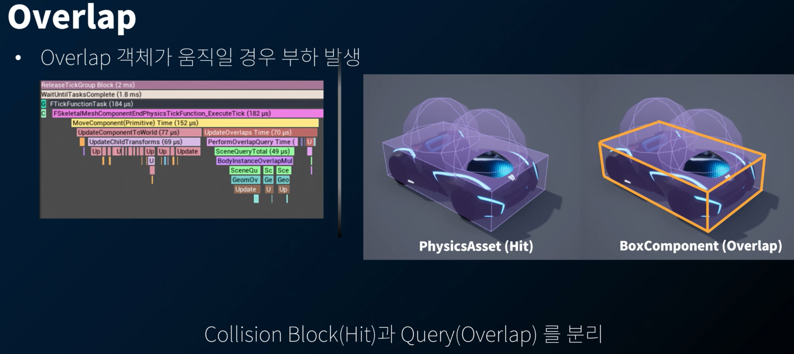 최대한 움직이지 않아도 되는 녀석은 Overlap 을 끄고, 카트바디에 대해서만 Overlap 을 활성화했다.