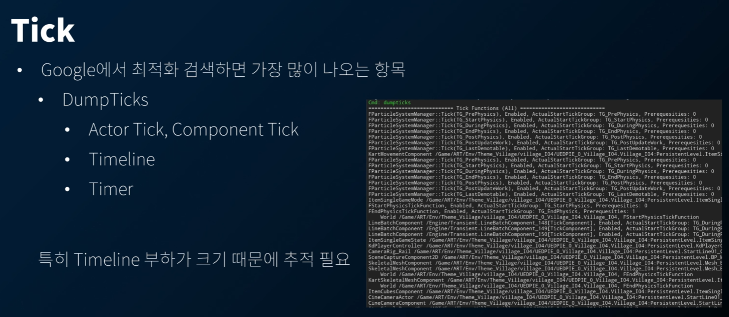 구글에서 최적화 검색을 하면 Tick 관련 이야기가 많이 나온다. 이때, DumpTicks 치트를 이용해 틱을 사용하는 객체들을 체크할 수 있다. 특히 Timeline 을 다른 방식으로 구현하는 게 좋다.