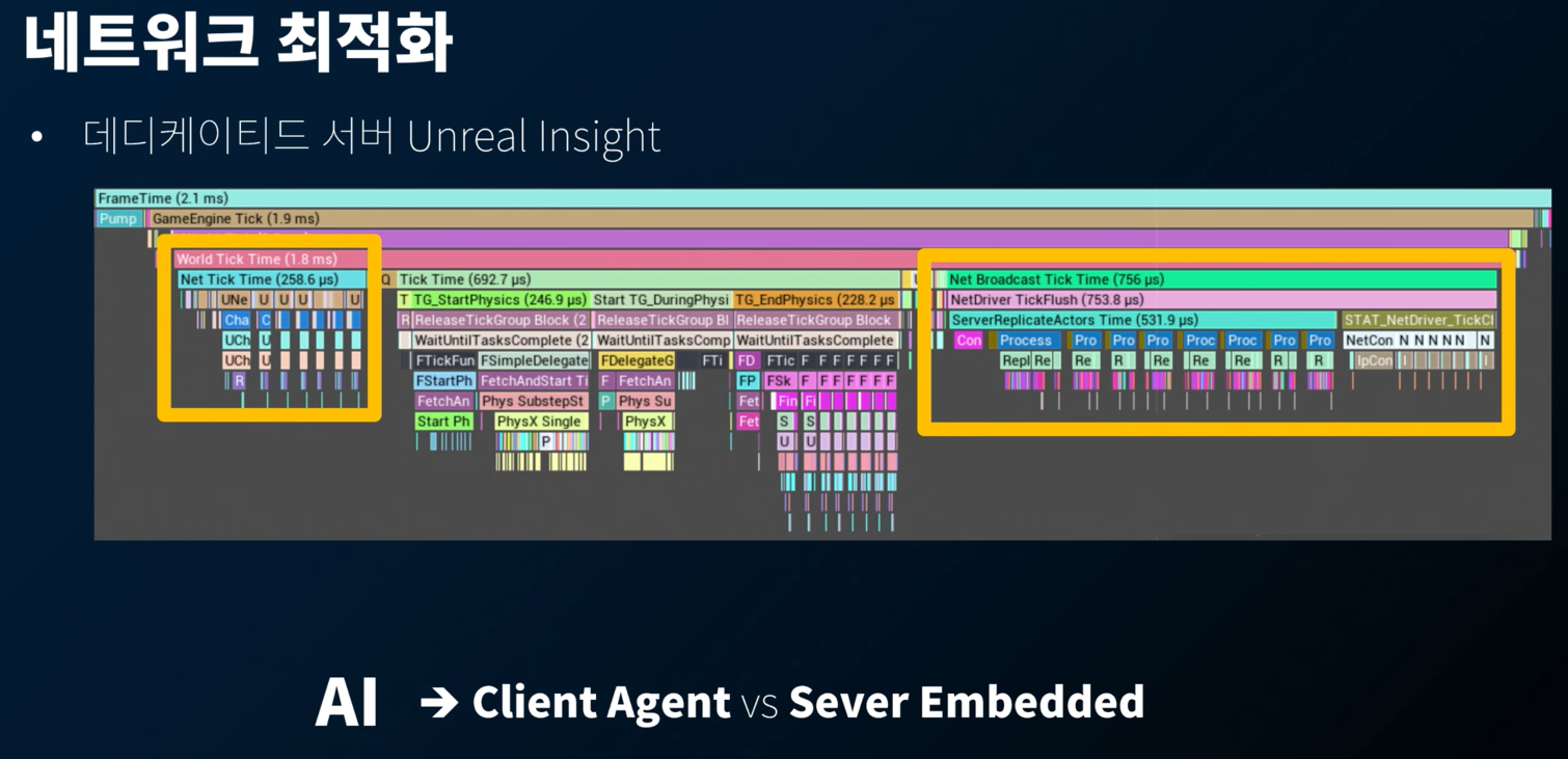 위의 WhiteList 에서 언급했듯, Cosmetic Layer 을 걷어내었으므로, 서버에서는 Validation 과 패킷 처리만 해주면 되었다. 이때, 패킷 처리하는 부분에 부하가 많았는데... Client Agent 에서 AI 관련 항목을 계산하기보다, 서버에서 계산해서 결과값을 보내주기만 하는 식으로 구현했다.