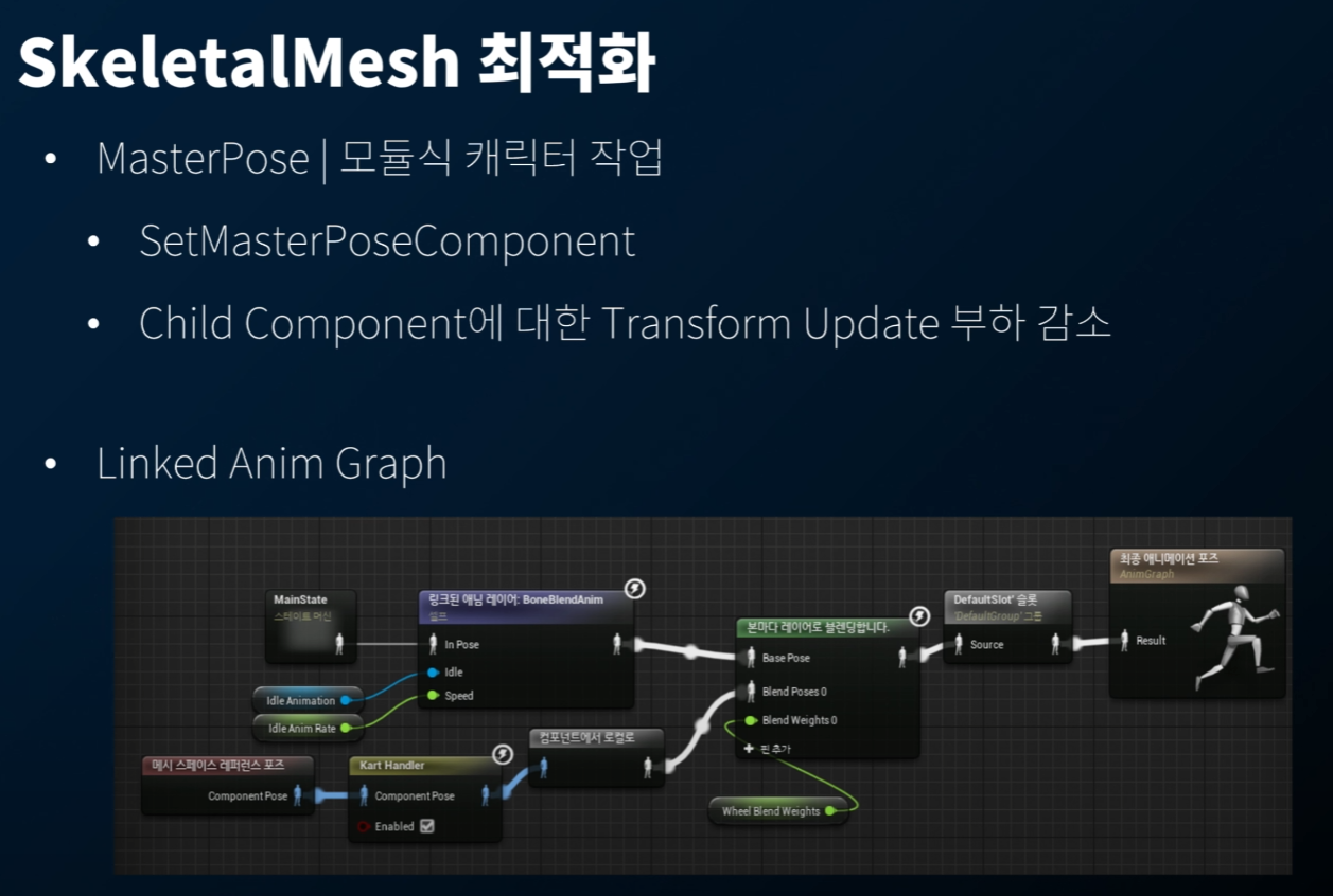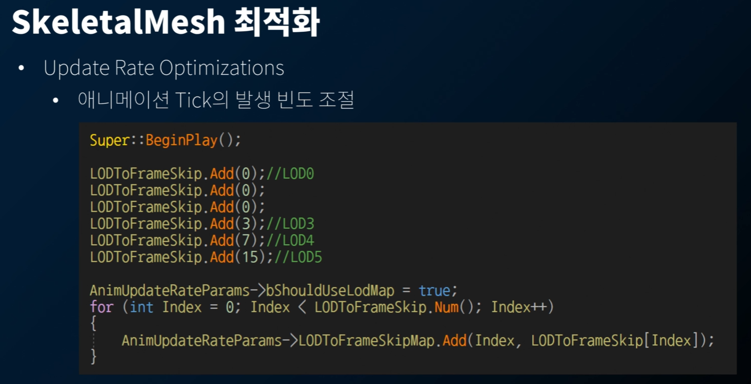 화면에 플레이어가 많이 보일 경우, Skeletal Mesh 최적화가 필요하다. LOD 의 경우 객체와 카메라 사이의 거리에 따라 좌우되는데, Device Profile 을 보고 세부적인 Tuning 을 해 주어야 한다.