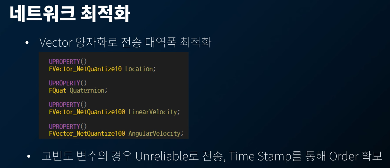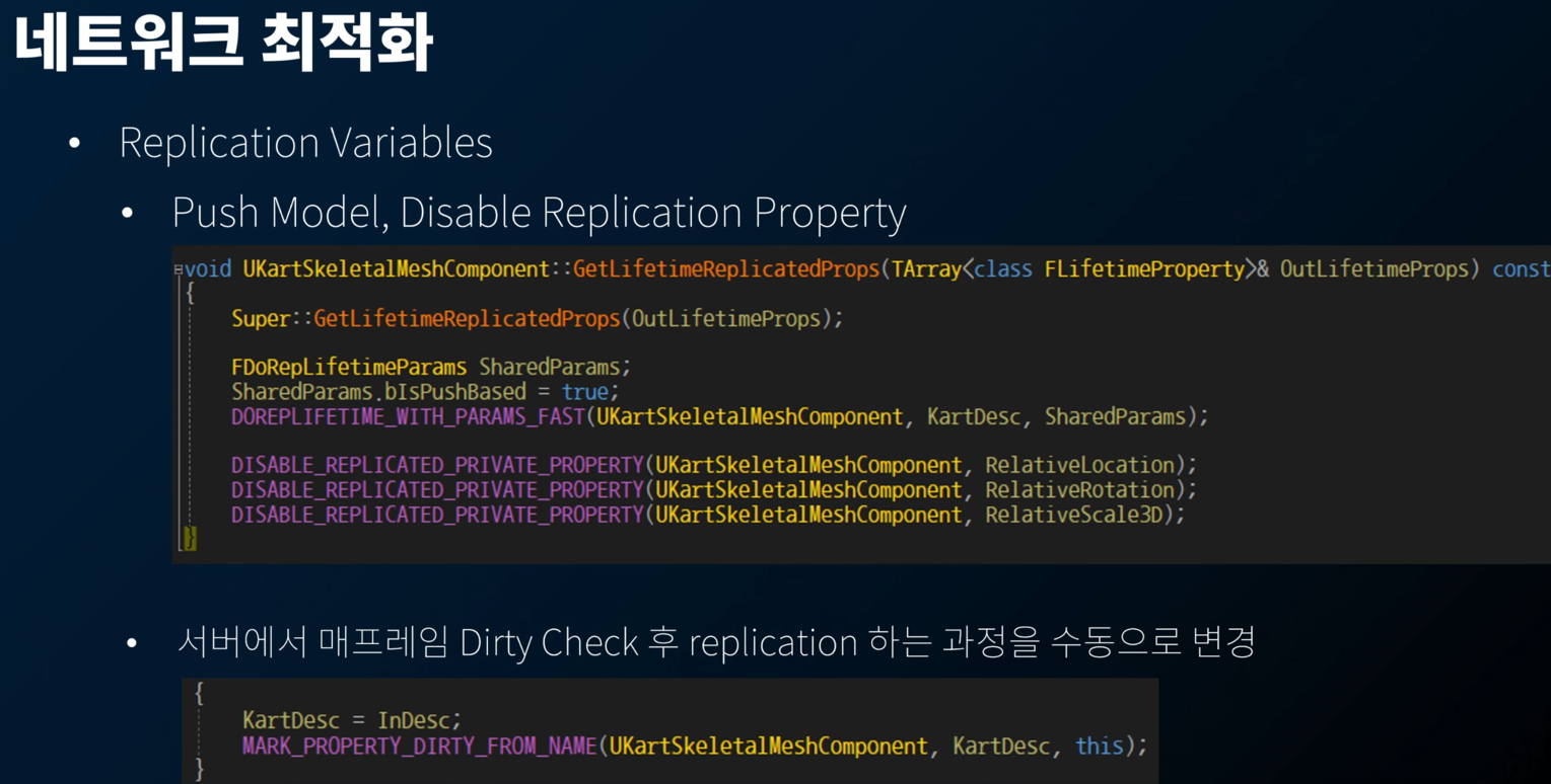 네트워크 최적화를 위해, Replication 변수에 대한 최적화를 진행함. 사용하지 않는 변수는 Disable 시키고, 매 프레임마다 변경이 일어나는 변수가 Replication 되므로, 서버에서 매 프레임 Dirty Check 후 replication 하도록 변경했다.
