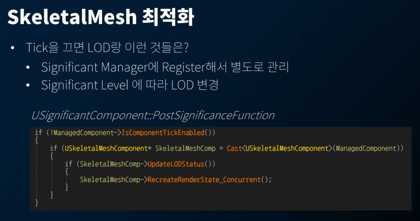 그런데, 틱을 끄면 LOD 가 갱신이 안되는데... 이를 Significant Manager 에 등록해서 별도로 관리해주면, Tick 이 Aggregate 되는 효과도 있었다.