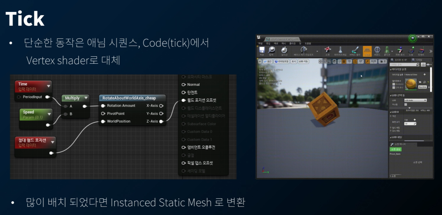 회전의 경우, 애니메이션에서 처리하기보다는, Material 에서 Vertex Shader 로 Rotation 을 해주면, 낮은 비용으로 구현할 수 있다.
