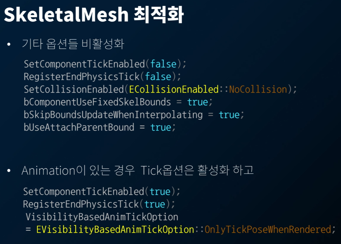 애니메이션이 있으면 틱을 비활성화 할 수 없으므로, 언제 틱을 활성화할지에 대한 Enum 값을 설정하여 옵션을 조절했다. 즉, 렌더될때만 틱이 돌아가도록 설정한 것이다.