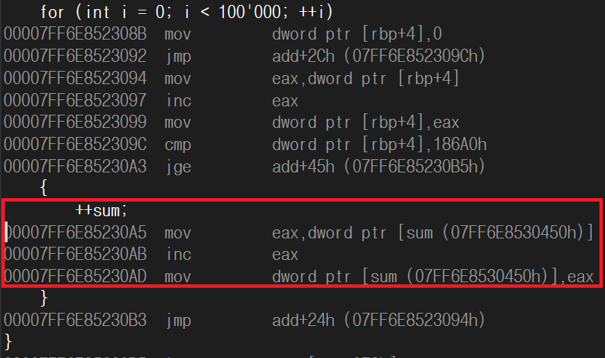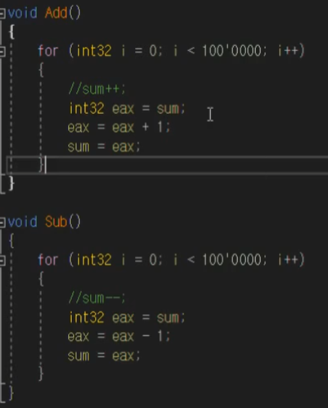 따라서, Add 와 Sub 를 하는 쓰레드가 sum 값에 접근할 때는, 실제로 갱신이 된 값을 건드리지 않고, 다른 쓰레드가 아직 연산을 하지 않은 상태의 eax 값에 연산을 할 수 있게 된다.
