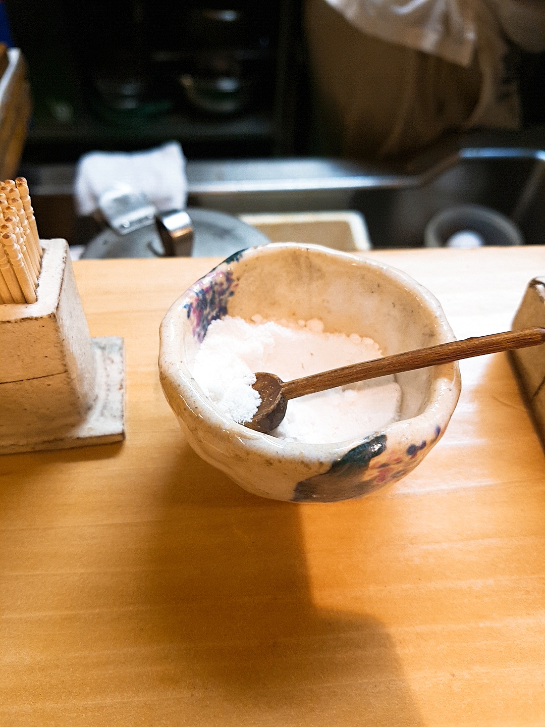사기 그릇에 흰 가루가 담겨나오길래 뭔가 했더니, 소금을 곱게 갈아 내어준 거였다.
