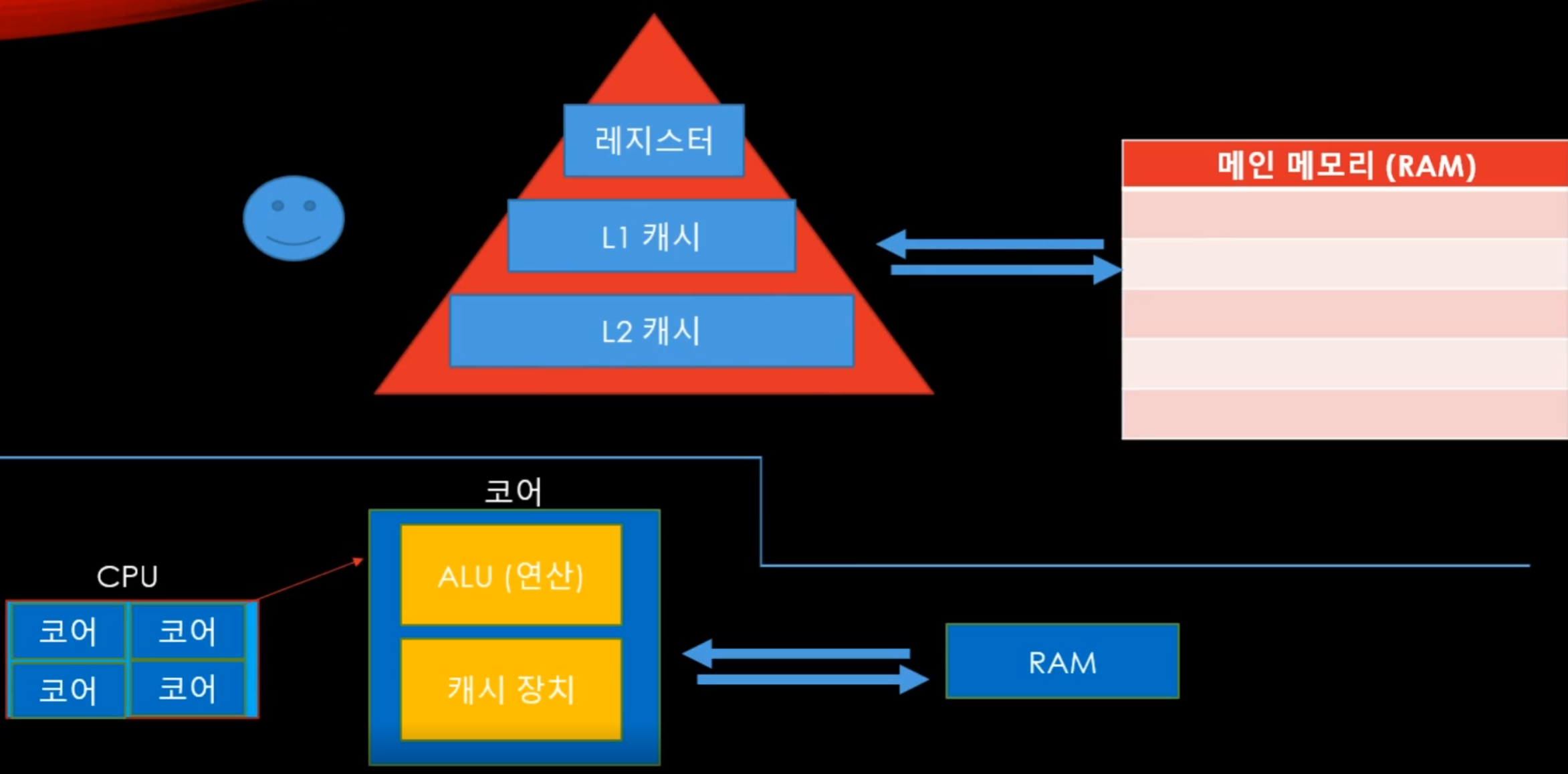 즉, 어떤 연산을 위해 RAM 으로부터 CPU 로 데이터를 옮길 때, 자주 쓰일 것으로 예상되는 것들을 캐시에 저장해 놓았다가, CPU 가 이를 다시금 필요로 할때 캐시를 먼저 조회하는 것이다! 😉