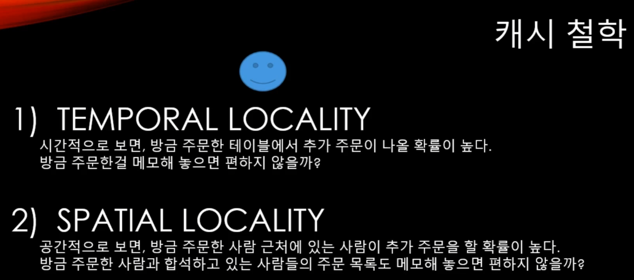 또한 시간 상으로도, 최근에 배달을 시킨 주소는 다시 시킬 확률이 높다고 하여 이를 캐시에 저장하기도 하는데... 이러한 캐시의 특성을 각각 Temporal Locality, Spatial Locality 라고 부른다!