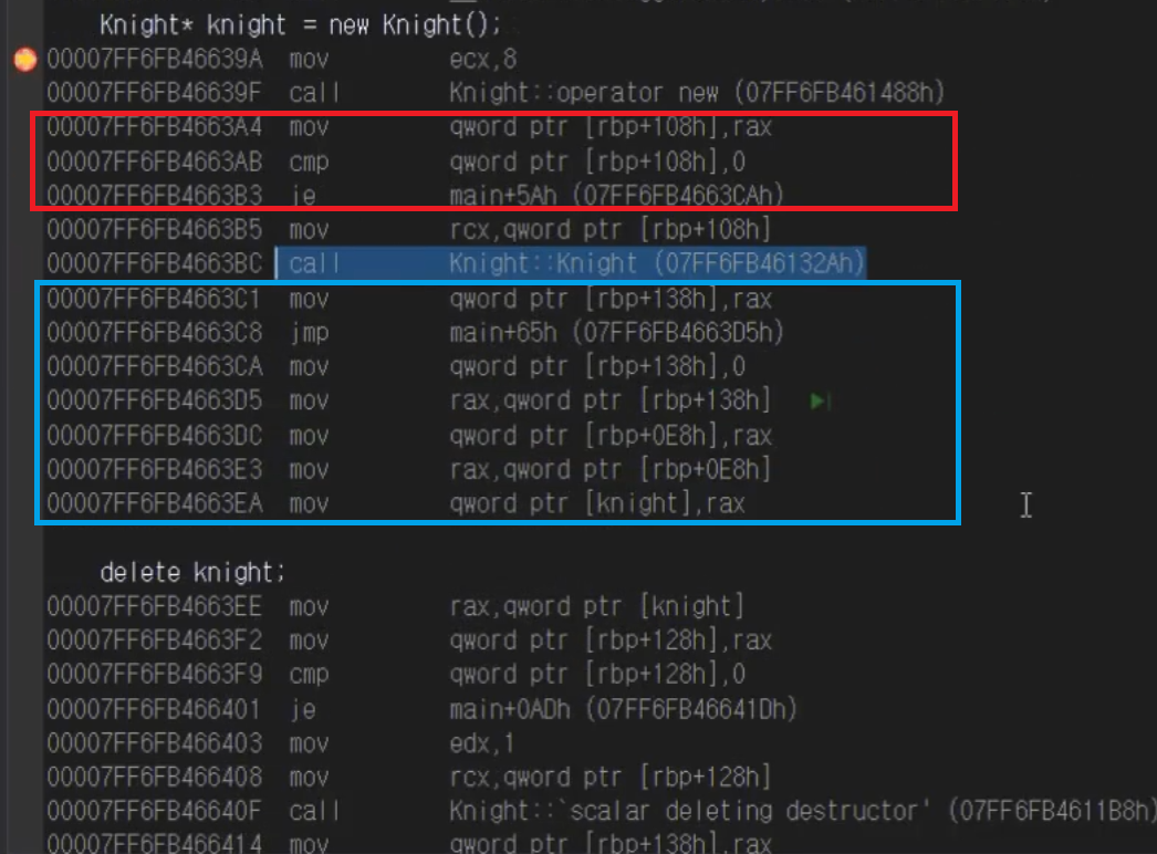 잘 보면, new Knight() 를 할 때, 메모리를 먼저 할당하고(빨간색), 그 다음 생성자를 호출하여 이것 저것 작업(파란색)을 하는 것을 확인할 수 있다 🤣