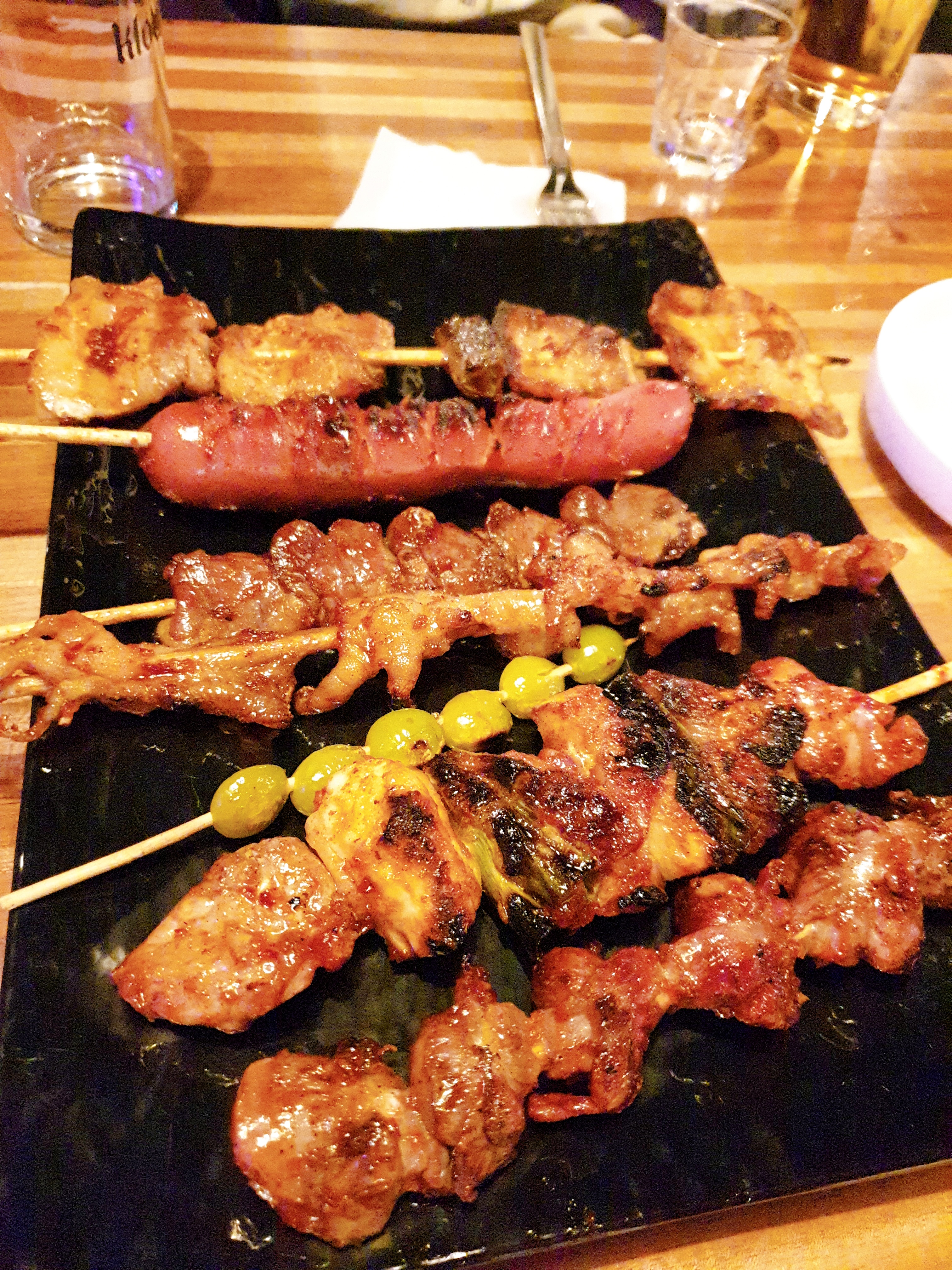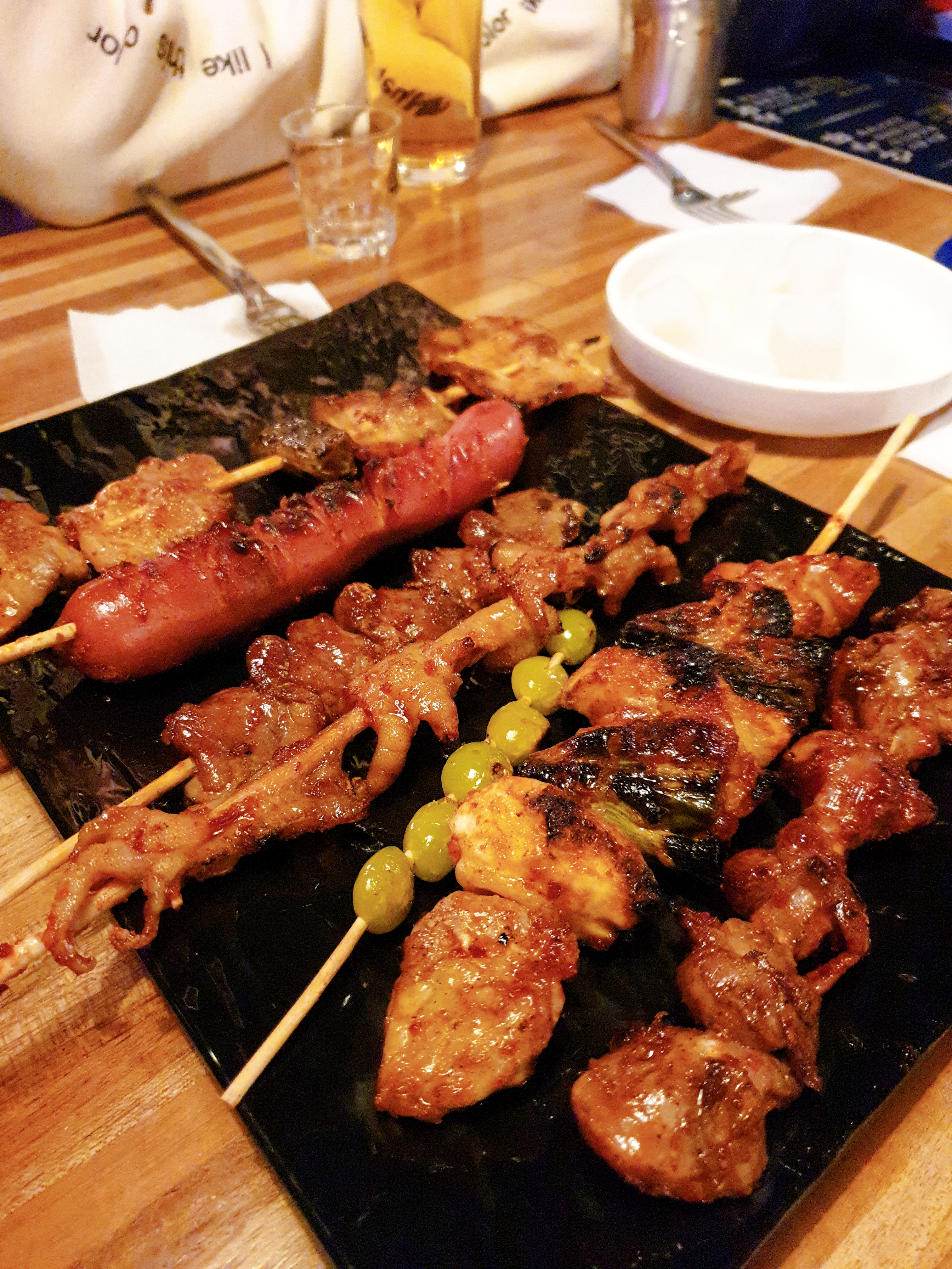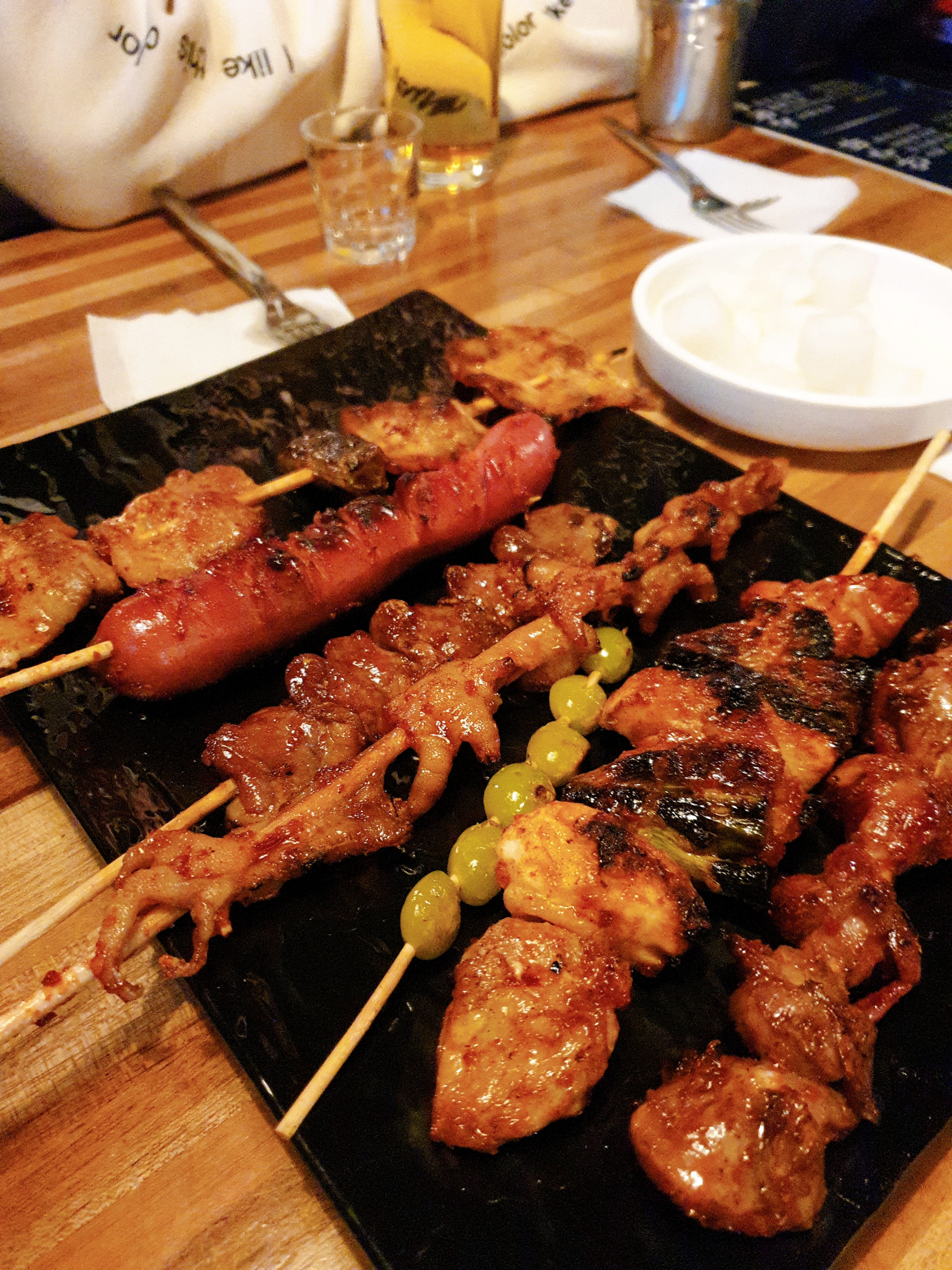 추천 메뉴로 시킨 꼬치 세트. 13900원에 삼겹살, 닭껍질, 소시지, 간, 닭발, 은행, 닭다리, 염통 꼬치를 맛볼 수 있는 혜자 메뉴다.
