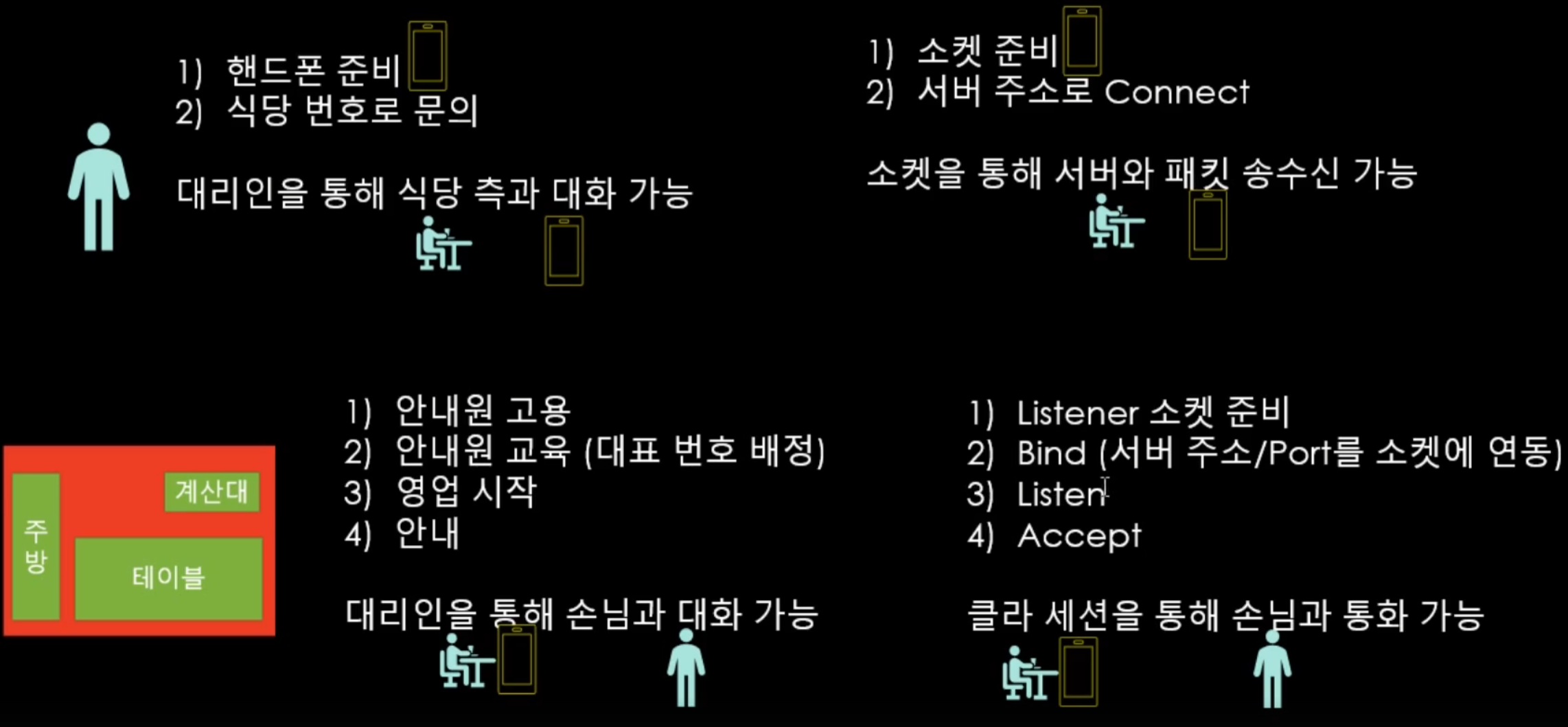 이 과정을 소켓 프로그래밍의 세팅 단계에 대입하면(정확한 대입은 아님) 다음과 같이 나오게 된다.