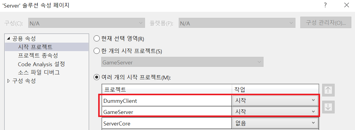 나중에 DummyClient 와 GameServer 를 동시에 시작하려면 아래와 같은 설정을 바꿔주면 된다(프로젝트 > 속성).
