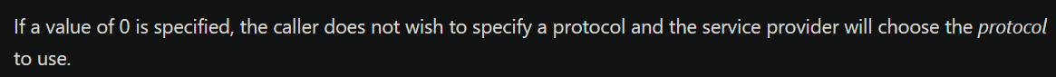 일단, 첫 인자는 Address Family 로, IPv4 를 쓸 것인지 IPv6 를 쓸 것인지를 결정한다. 두 번째인 type 은 TCP 를 사용할 것인지, UDP 를 사용할 것인지를 의미하며, 마지막인 protocol 의 경우, 0을 넣어주면 알아서 결정해 준다.