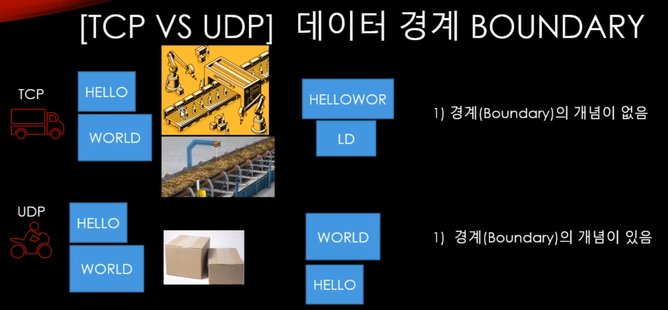 TCP 의 경우 ,경계가 없어 데이터가 쪼개져 보내질 수는 있으나, 순서는 보장된다.