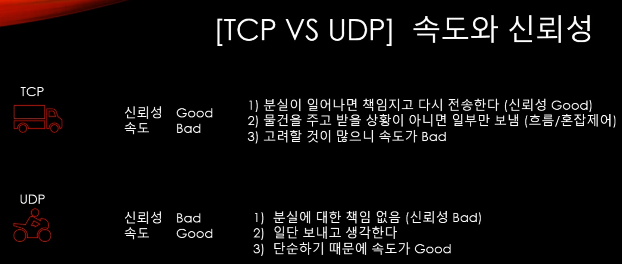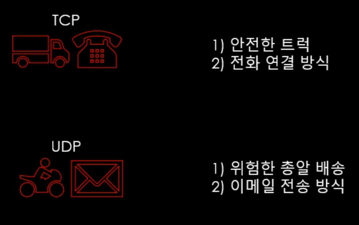 TCP 는 안전한 트럭 내지는 전화 연결 방식에 가깝고, UDP 는 '위험한' 총알 배송 및 이메일 전송 방식에 가깝다. 좀 더 자세히 풀어보면...