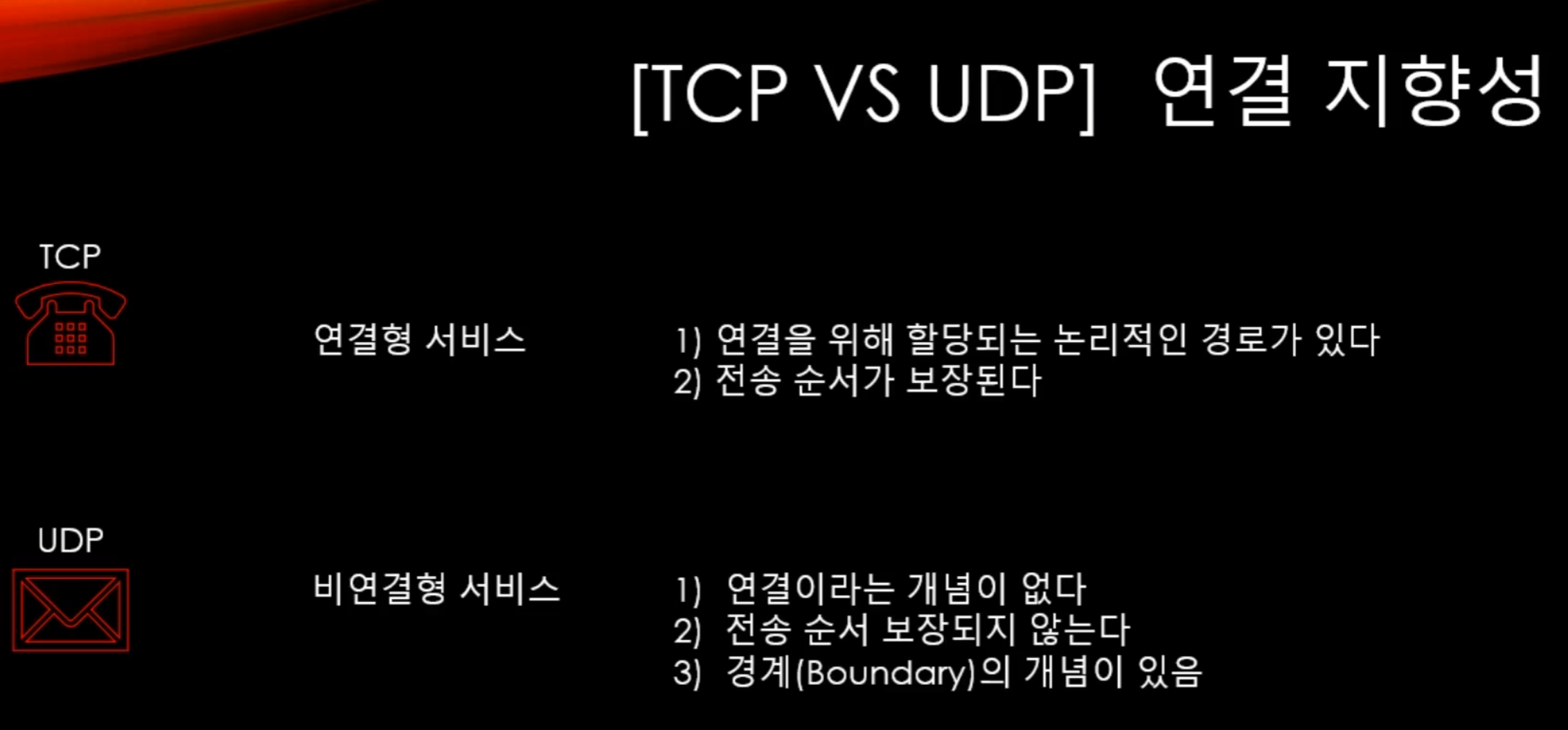 TCP 와 UDP 의 연결 지향성의 차이가 있기에, 각각의 특징이 다르다고 볼 수 있다. TCP 는 전화에, UDP 는 메일에 가깝다.