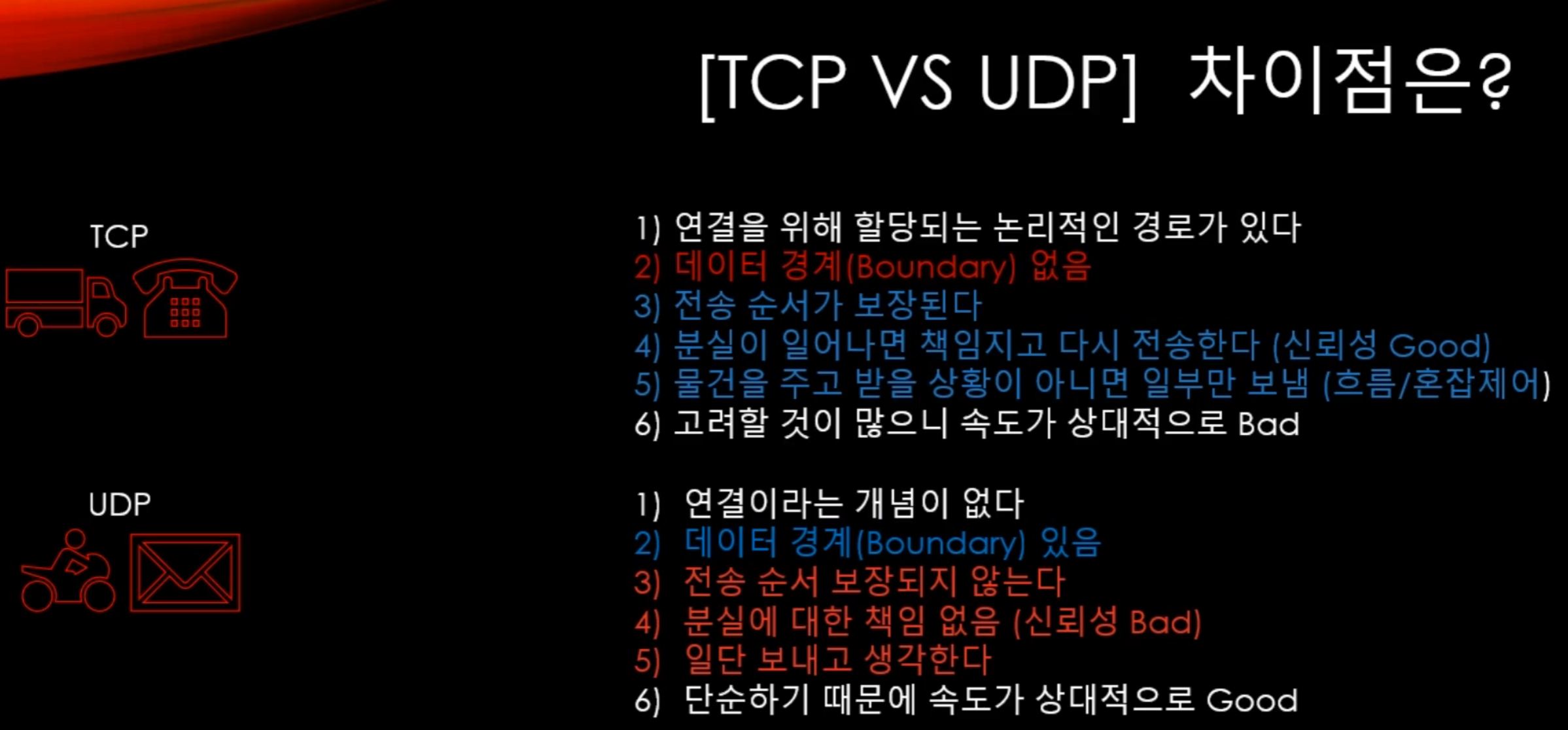 2. TCP 는 안전하며(데이터 유실이 없음), 데이터의 순서가 보장된다. 하지만 각 패킷의 경계(Boundary)가 없어 데이터가 합쳐지거나 쪼개질 수 있으며, UDP 에 비해 상대적으로 느리다.