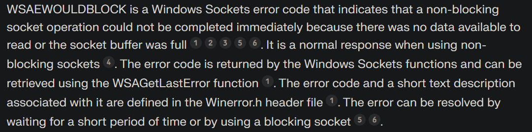 그런데 논블로킹 소켓의 경우, 작은 논블로킹 소켓을 건드리면 안되기 때문에, 작은 논블로킹 소켓은 될때까지 계속 츄라이를 한다. 그러다 보니 에러가 WSAEWOULDBLOCK 일 경우에는, 계속 시도를 한다. 참고로 WSAEWOULDBLOCK 이란...