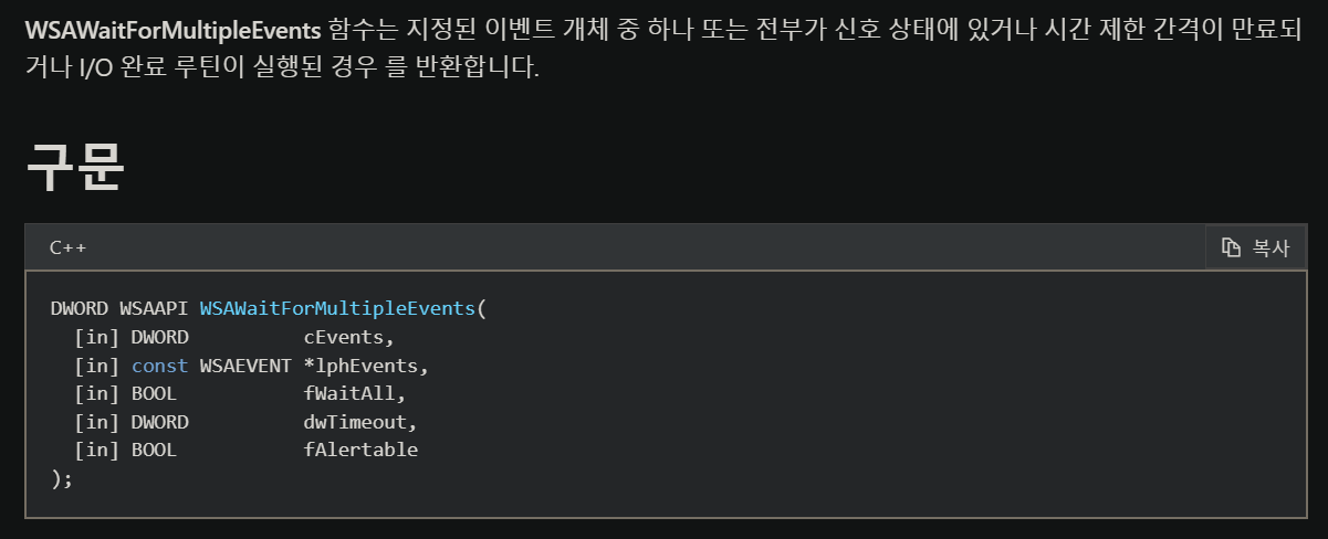 특정 이벤트를 바인딩할 수도 있고, 모든 이벤트를 기다릴 수도 있다. 일단 우리는 아까 생성한 listenSocket 에 붙은 Event 하나에 대해서만 기다릴 것이고, 올 때까지 무한정(WSA_INFINITE) 기다린다.