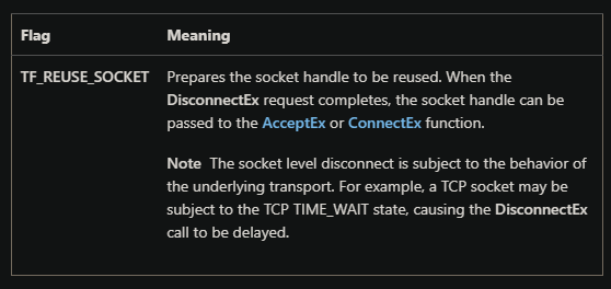 소켓의 연결을 종료하면서, 소켓의 핸들의 재사용이 가능하도록 만드는 함수라고 되어 있다. 사실, 위에서 우리가 넣었던 TF_REUSE_SOCKET 인자가 그 기능을 하도록 만들어 준다. 😉