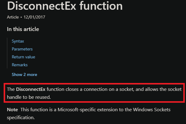 Disconnect 이벤트를 처리하면서, 소켓과의 연결을 끊어주고 있다(DisconnectEx 함수). 이 함수의 설명을 MS 문서에서 살펴보면,