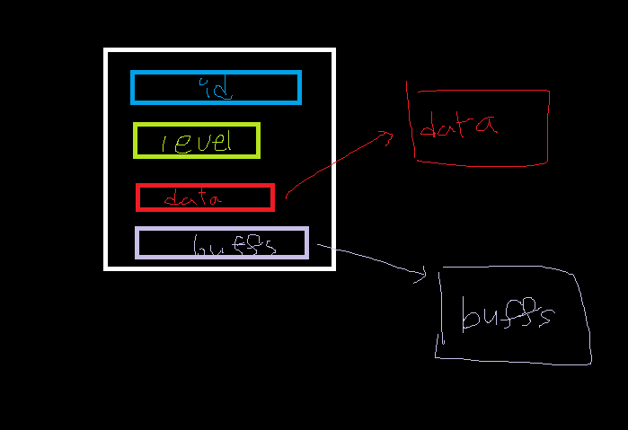 일단, id 와 level 은 그렇다 쳐도, data 에 해당하는 녀석은 메모리 주소이므로, 크래시가 발생하게 될 것이다. 😂 또한, 가변 데이터인 buffs 에 대해서도 어떻게 저장하면 좋을지에 대한 아이디어가 필요하다.