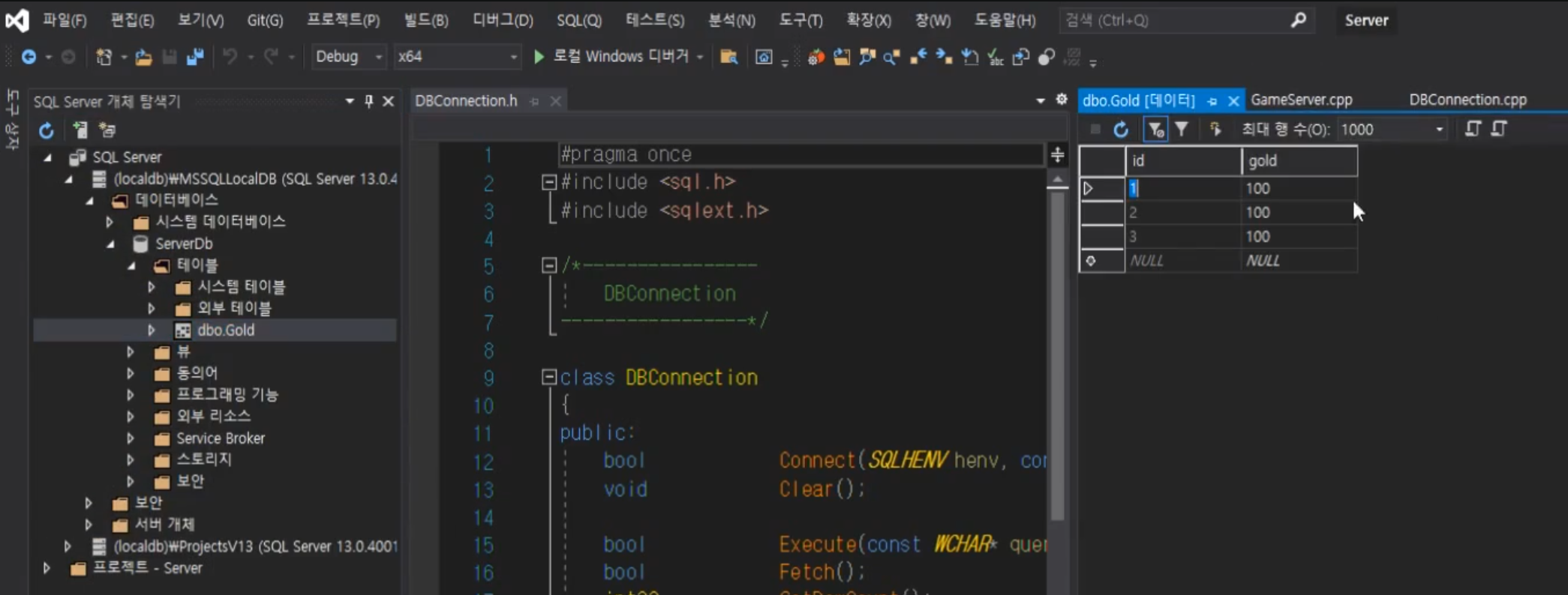 그럼 이제 GameServer 에서 아래와 같이 SQL 서버를 연동하고, 쿼리를 쏴볼 수 있다.