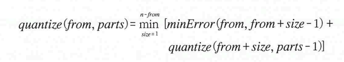 minError 는 한 묶음 내에서 오차를 구하는 함수이다. from 은 시작 지점, parts 는 사용 가능한 남은 양자화 숫자의 수를 의미한다.