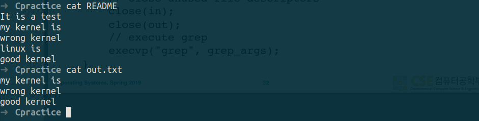 How can we implement grep kernel < README > out.txt? (shell read README, find lines which contains keyword kernel, and then it writes it into out.txt)